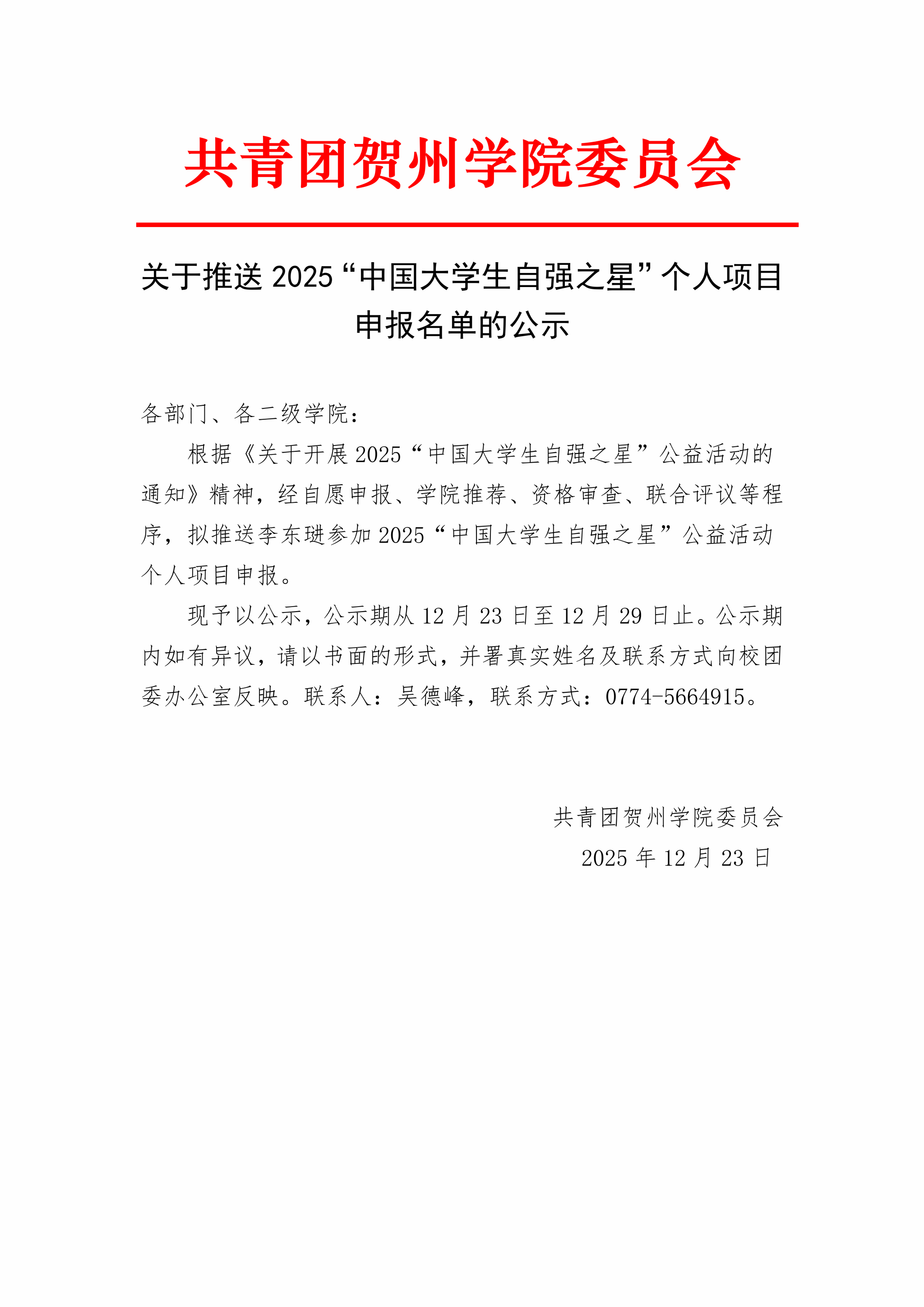 关于推送2025“中国大学生自强之星”个人项目申报名单的公示